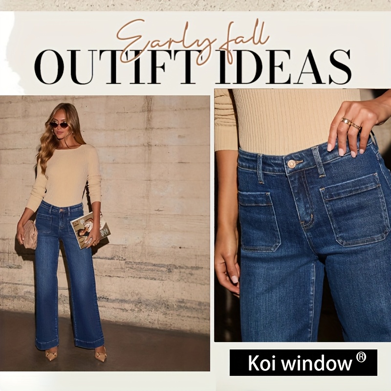 1pc Women'S High- Waisted Wide- Leg Jeans, Vintage Wash Trousers with Pocket Detail, Trendy Loose- Fit Pants Casual Outfits