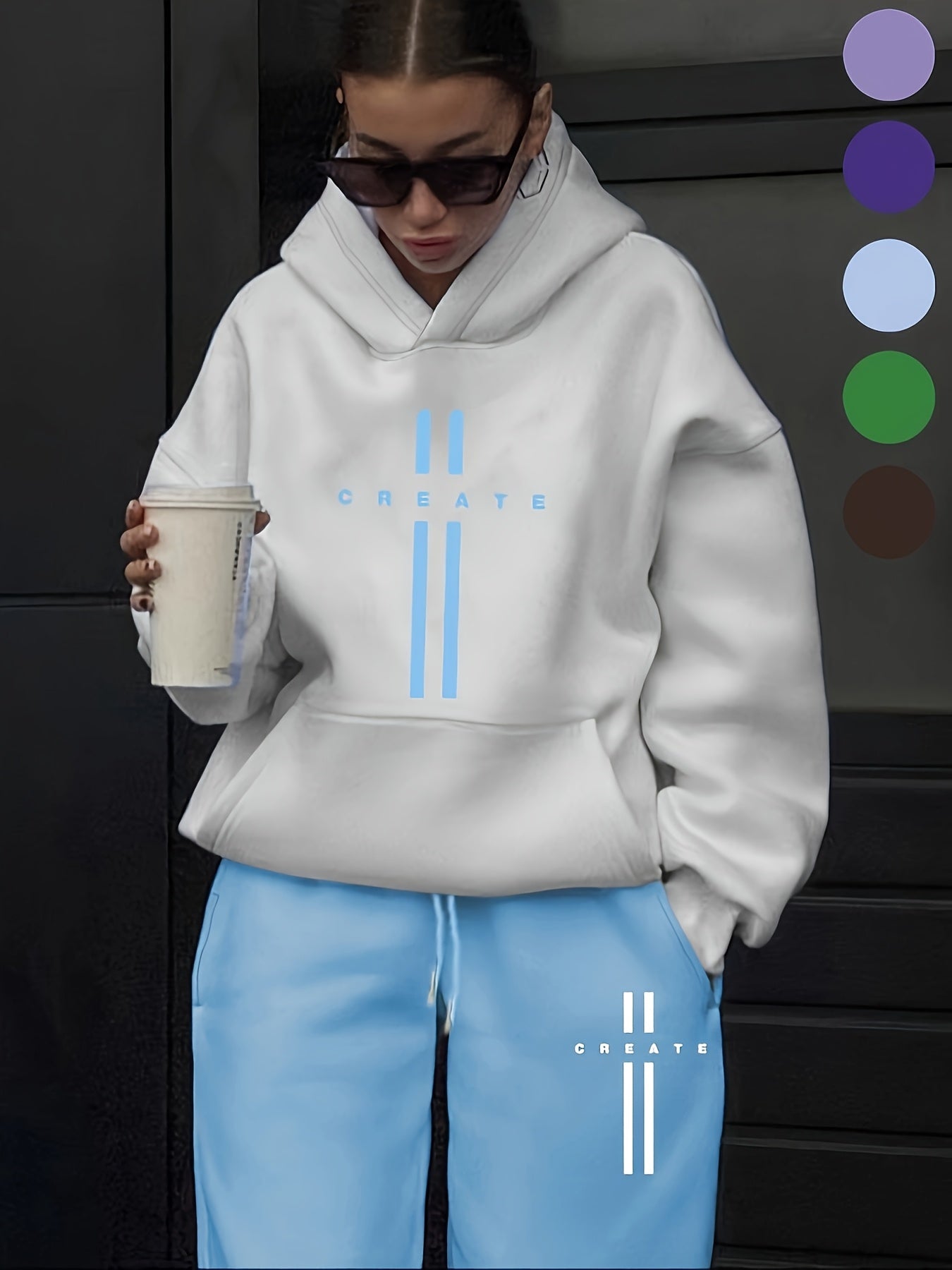 Women'S 2pcs Outfits CREATE Print Hoodie And Sweatpants Set, Fall Winter Oversized Fleece-Lined Casual With Pockets